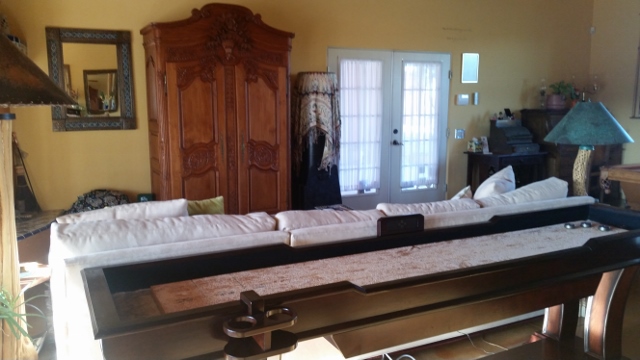 Then, in the common area was a pool table, shuffleboard, a large screen TV housed in a spectacular entertainment center, a couch that you didn’t want to get out of, a formal dining room, a small reading nook, and access to music piped into the area. It was wonderful. Outside was just as amazing!