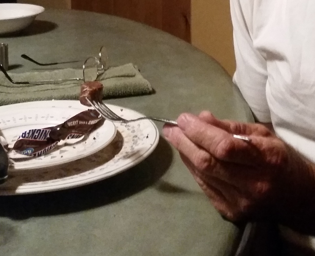 Yes, Carl is eating his Snickers with a fork…lol |