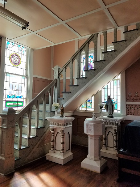 Many painting techniques are used. Stenciling, freehand, marbling and graining I had heard of. Infill and pounce painting, variations on stenciling using charcoal rubbings, was new to me. I was in awe of what simple painting and special techniques can do to the appearance of WOOD. If you didn’t know the ‘marble’ pillars were wood before you saw them, you’d never know. Just gorgeous!